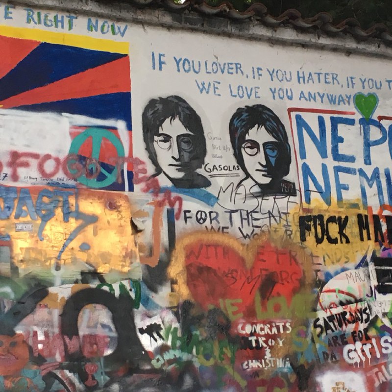 На Велкопржеворській (фух) площі знаходиться одне з улюблених місць всіх фанатів Beatles і не тільки – стіна Джона Леннона. Спершу місцева влада намагалася зупинити розвиток хаотичного мистецтва графіки, та згодом це стало популярним туристичним місцем. Найцікавіше, що стіна постійно змінюється: з’являються нові малюнки та написи. Навіть за час нашого перебування у Празі стіна встигла зазнати значних перетворень – процес творення мистецтва не зупиняється ні на мить. Кажуть, що найвідданіші фанати зможуть серед тисяч надписів розпізнати автограф самого Леннона. У вас вийшло?